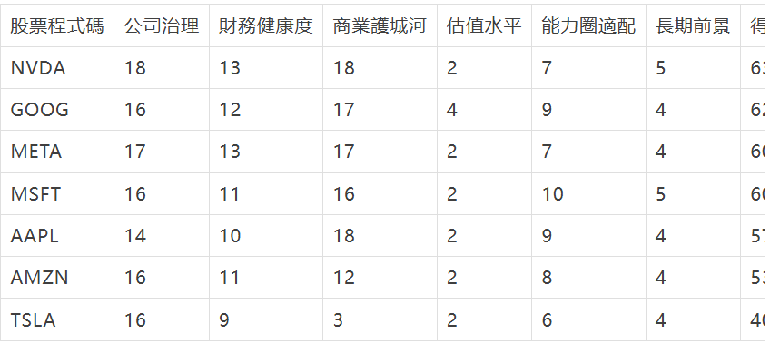 巴菲特最看重護城河,它代表公司持續賺錢的能力。體檢報告中,NVDA(18)、AAPL(18)、GOOG(17)、META(17)、MSFT(16) 都拿到了高分甚至滿分,這符合我們對這些巨頭技術壁壘、品牌生態、網路效應的認知。