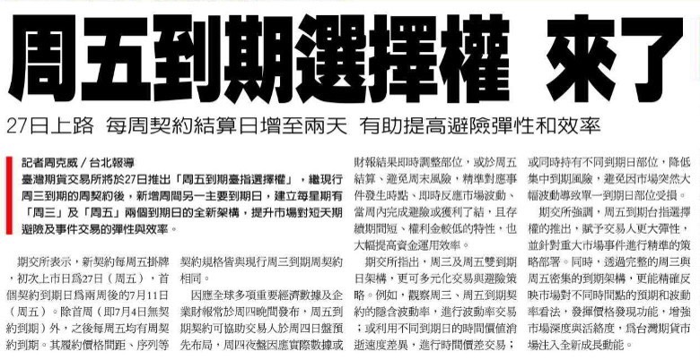 近期,期交所公告將於 6/27(五)推出全新商品——「週五到期台指選擇權(TXO Friday Weekly)」,結算制度將從每週三一次,變成「每週兩次」結算,提供更多彈性給短線交易人與事件應對者。