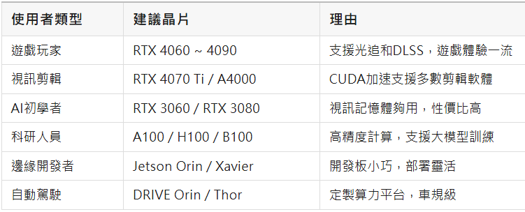 📌 如果你是遊戲玩家或視訊製作者,GeForce RTX 30/40系依舊是主力選擇;如果你是AI初學者,性價比高的RTX 3060/3070或更划算。
