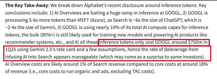 按Gemini2.5費率估算,1Q25推理成本約7.5億美元,僅佔搜尋收入的≈1%(佔COGS+Opex1.6%);即便token按4倍速度繼續攀升,也仍低於搜尋核心基礎設施成本(≈18%收入),緩解市場對利潤率下滑的擔憂。
