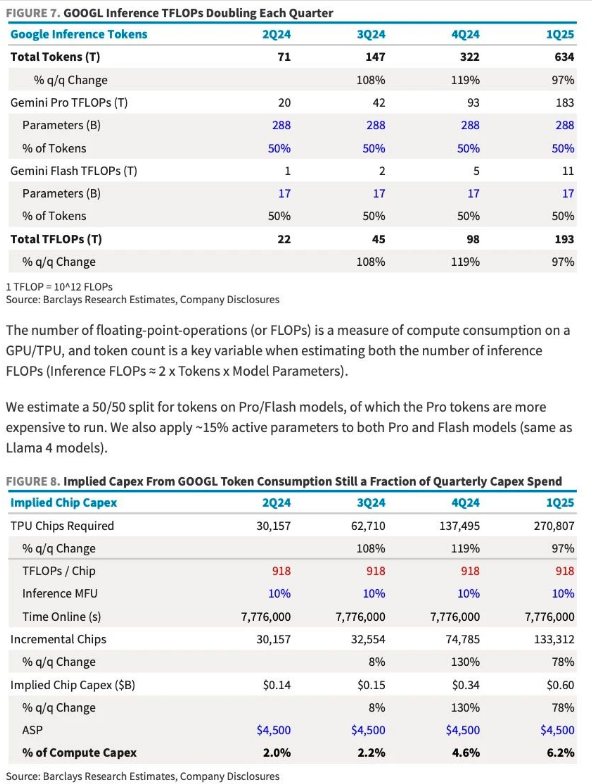 採用50/50Pro與Flash模型、15%ActiveParameters假設,Google僅用≈270kTPUv6(ASP≈4,500美元)即可覆蓋1Q25推理負荷,體現自研加速器在功耗與成本端的優勢。