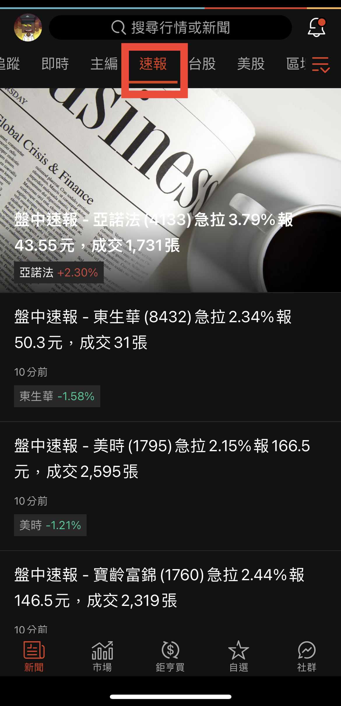 美股CPI暴雷導致台股開盤重挫,唯獨生技族群逆勢上漲,若盤中想第一時間掌握個股與產業的脈動,「鉅亨新聞速報」會是你盯盤最好的工具,盤中股價急漲急跌,類股產業領漲領跌,價量瞬間變化等,有鉅亨幫你把關,投資趨勢一手掌握