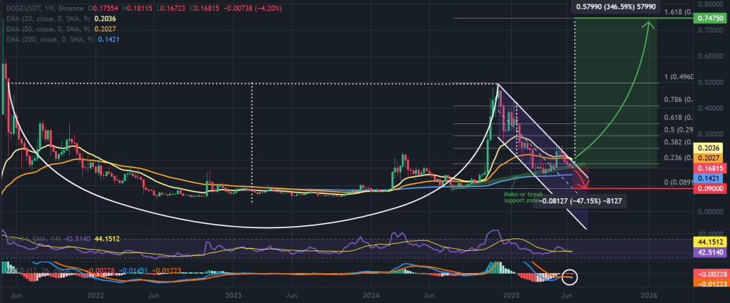 若 DOGE 本週收盤跌破 $0.168,下一個主要支撐位將下探至 $0.09 美元,該區域上次被測試是在 2024 年中。
