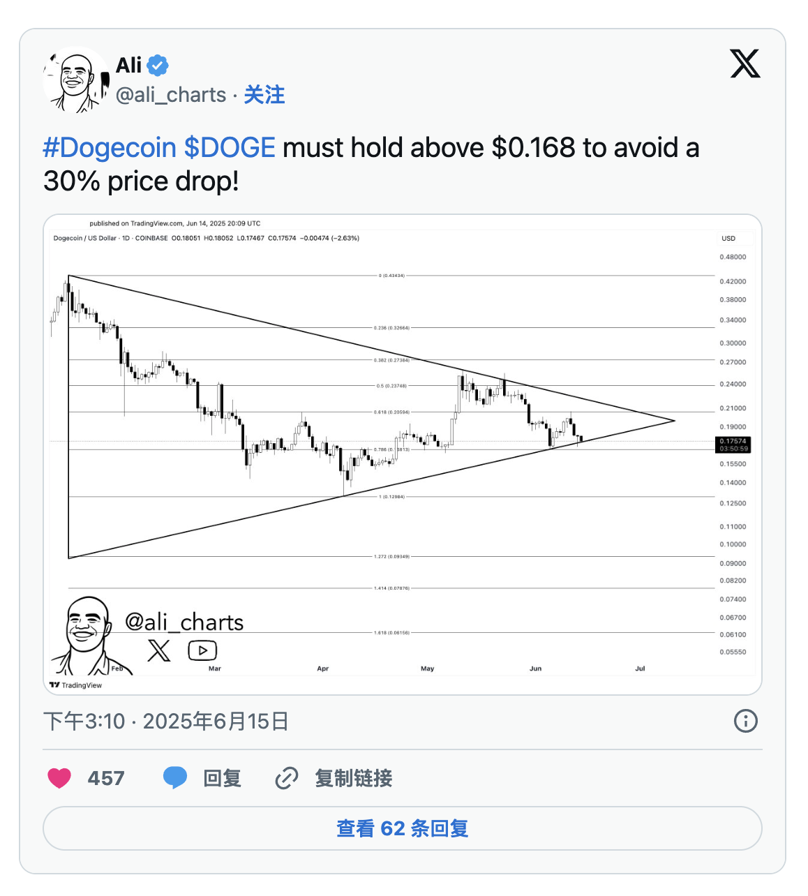 根據知名 X 平台分析師 Ali Charts 的說法,該價位正好處於一個對稱三角形的下邊界。若出現跌破,可能會引發高達 30% 的回檔。