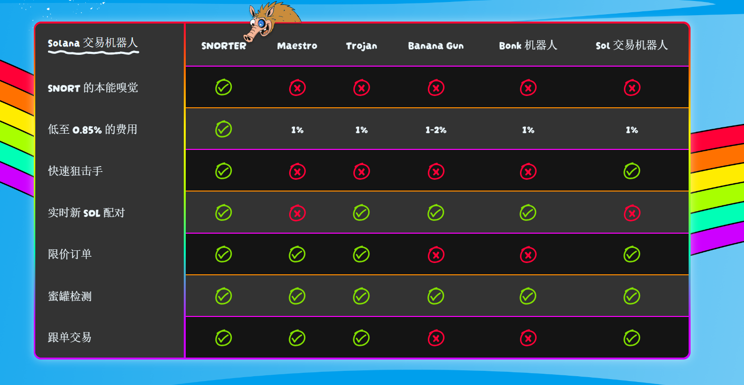 雖然交易機器人並非新概念,Snorter 卻是專為限價單狙擊而設計,同時支援 抗 MEV 的代幣交換、跟單交易(copy trading),甚至具備 防拉地毯機制(rug-pull protection)。