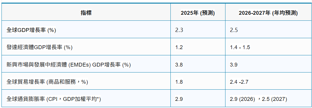 核心資料:2025年全球GDP增長率預計將從2024年的2.8%大幅放緩至2.3%,是2008年金融危機以來(不計2009年和2020年全球衰退)的最慢增速。2026-2027年雖預計溫和復甦至年均2.5%,但仍遠低於疫情前十年3.1%的平均水平,也低於1月份的預測值。