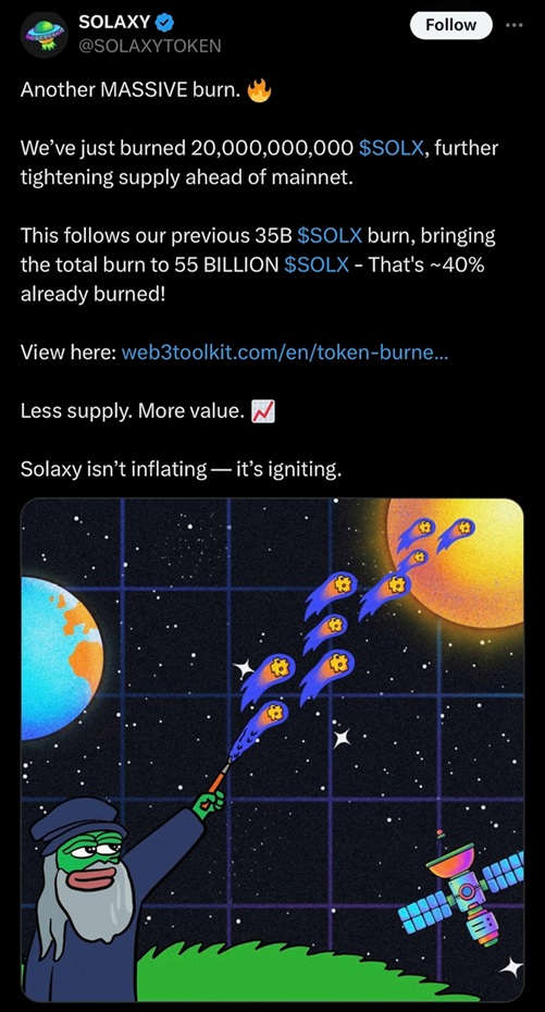 這一輪銷毀動作等於直接清除了總供應量的40%,在如此早期的階段實現如此高比例的通縮,極為罕見,也為SOLX奠定了稀缺性基礎。