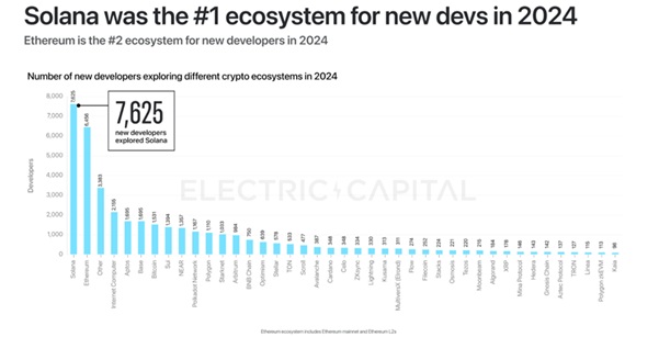 這一趨勢也得到了Electric Capital報告的支持:過去一年中,Solana共吸引了7,625名新開發者,超過了以太坊的6,456人。這是自2016年以來,首次有其他區塊鏈網路在新開發者數量上超過以太坊。