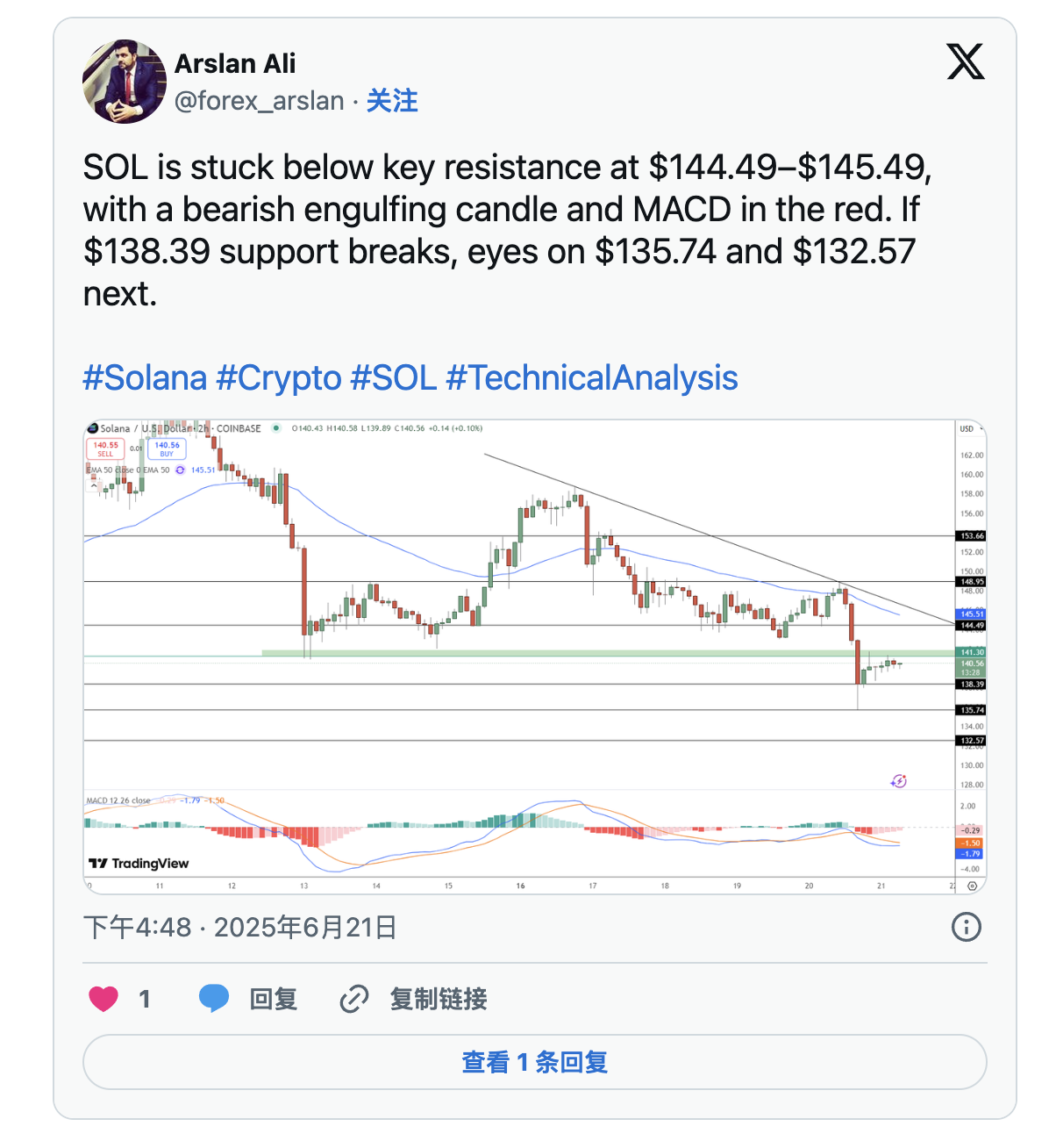 在上一次突破失敗後,出現了一條「看跌吞沒」(bearish engulfing)的K線,導致 SOL 進入盤整階段,目前徘徊在 $138.39 支撐位上方。