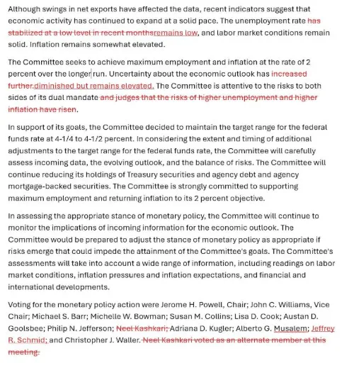 此外,聲明中刪除了先前對「失業率與通脹風險並存」的明確表述,轉而強調「關注其雙重使命兩方面的風險」。此舉反映近期失業率穩定在4.2%,通脹亦顯放緩,委員會對勞動市場與物價壓力的擔憂有所降溫。