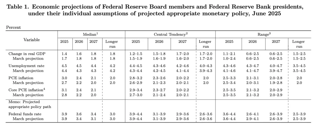 經濟增長預測下調:聯準會在本次會議中大幅下調2025年GDP成長預測,自3月的1.7%下修至1.4%,反映對近期加徵關稅可能抑制企業投資與消費的擔憂。儘管如此,Powell強調經濟仍展現出一定韌性,短期內維持1.5%至2%的溫和擴張步伐。
