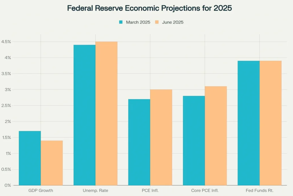 失業率預測微調:2025年失業率預測從3月的4.4%小幅上調至4.5%。這一調整雖然幅度不大,但反映了委員會對勞動市場可能轉弱的擔憂。2026年失業率預測從4.3%上調至4.5%,表明委員會預期勞動市場疲軟將持續更長時間。2027年的失業率預測也從4.3%小幅上調至4.4%。