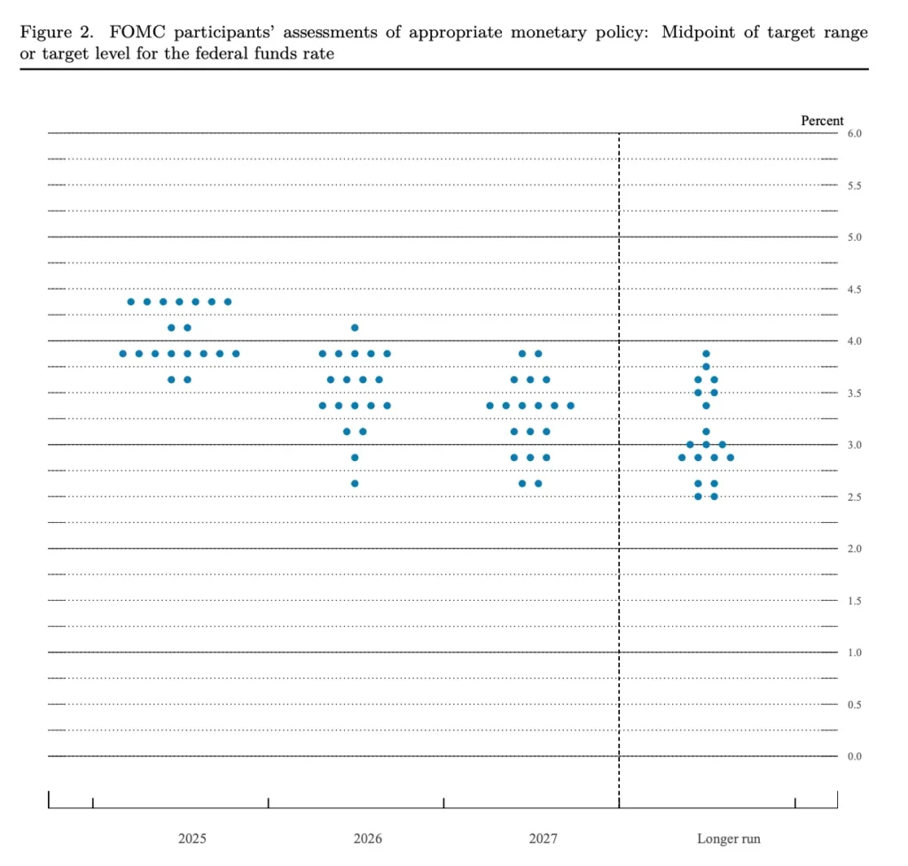 於FOMC釋出最新版的點陣圖顯示,委員會對未來利率路徑的分歧明顯擴大。不預期2025年降息的官員人數由3月的4位增至7位,占比自21.1%升至36.8%,反映出部分委員對通膨黏著性與外部風險仍抱持警戒。儘管如此,中位數預測仍顯示全年預期降息兩次、合計50個基點,顯示延後但不取消的基調仍具共識。