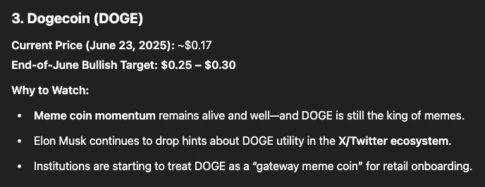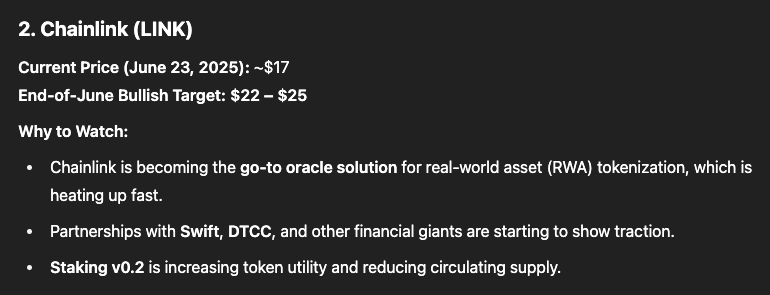 根據 ChatGPT 的判斷,部分山寨幣具備強勢爆發潛力,這些預測來自多維因素綜合判斷,包括:K 線形態、宏觀經濟趨勢、協議基本面、以及全球監管動向等。