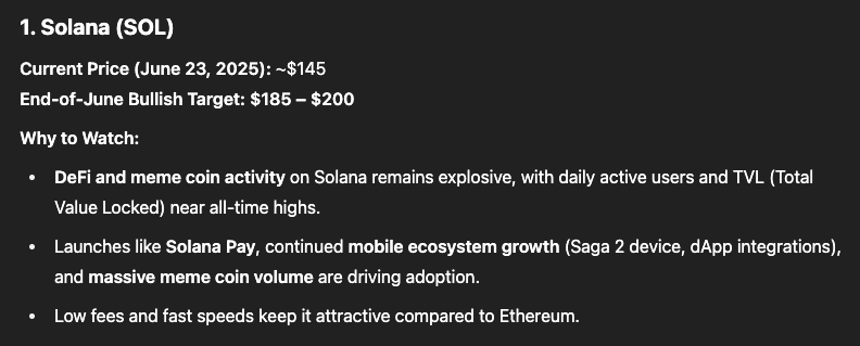 根據趨勢結構與動能指針分析,ChatGPT 預估 SOL 年中可望挑戰 $200 價位。不過從圖形來看,若行情續強,$250 附近恐迎來首波壓力位。若能穩住支撐,Solana 最快在秋季前達到 2 倍翻倍目標並非不可能。