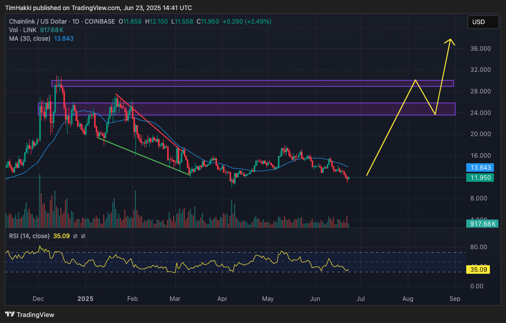 儘管如此,從技術面來看,Chainlink 的 RSI(相對強弱指標)目前徘徊在 35 附近,顯示近期拋壓已使 LINK 價格被大幅低估。這類低位區常被視為「抄底吸籌區間」,不少交易者正伺機撿便宜、提前卡位。