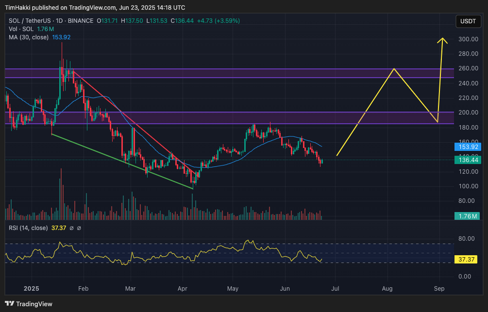 從技術面來看,SOL 已完成趨勢反轉。自 1 月高點 $250 跌至 4 月低點 $100 後,SOL 成功突破下降楔形整理區間,這通常被視為強勢上漲前的訊號。