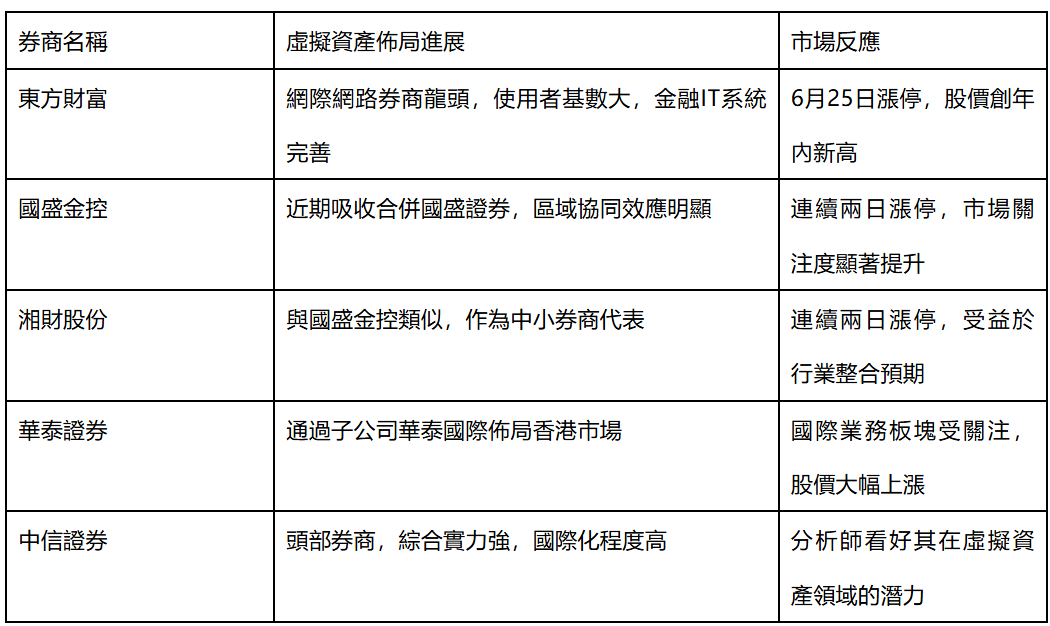 國泰君安國際作為首家獲批的香港中資券商,其成功經驗將為A股券商提供重要參考。多家券商已開始佈局虛擬資產相關業務: