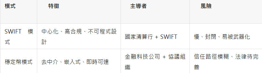 就在 SWIFT 佔據主路的同時,另一個系統正在悄然崛起——穩定幣清算體系。