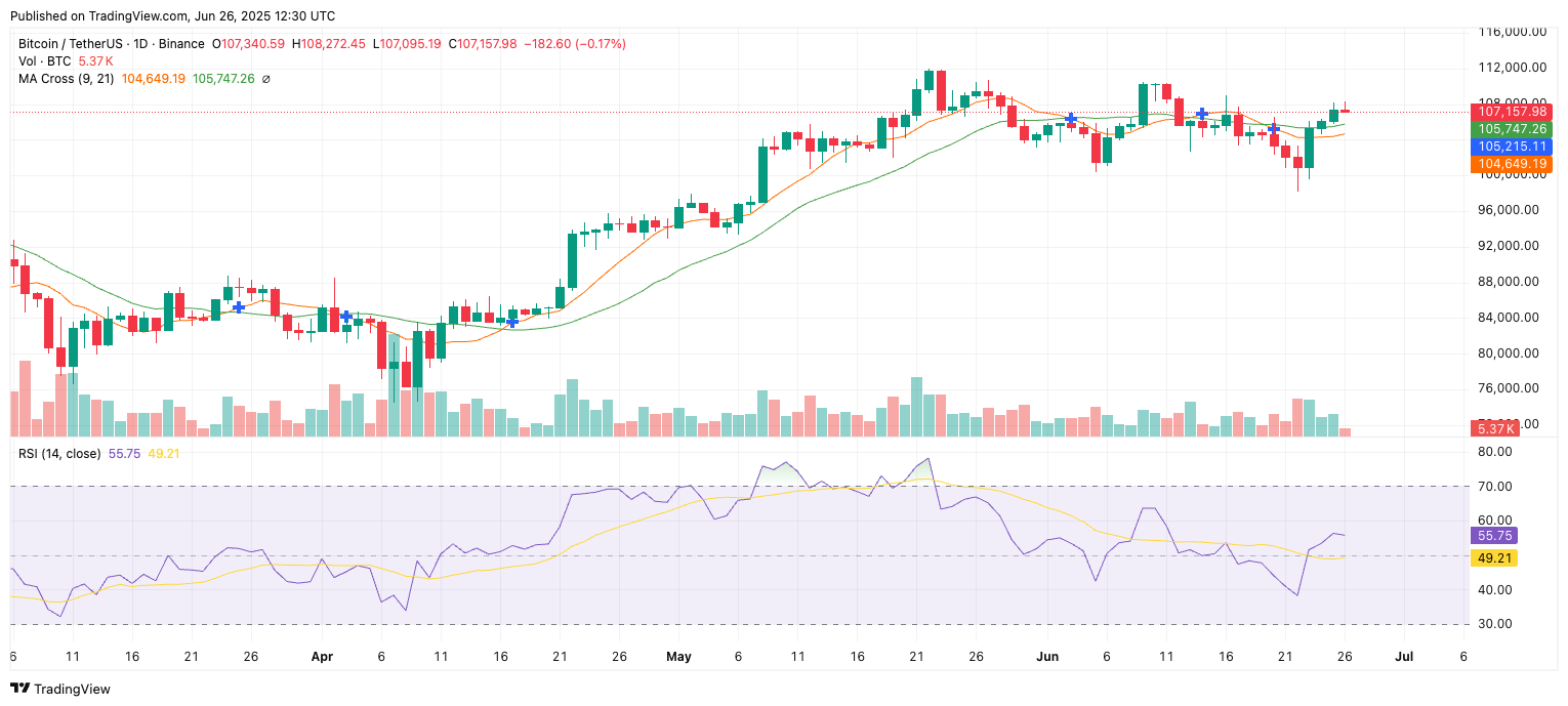 在2025年北約峰會上,美國總統川普對一名訪談者的提問回應說,他很快就會宣布聯準會董事長的替代人選。由於市場動態不斷變化以及川普的評論,比特幣價格在6月25日以1.19%的漲幅以正面姿態收盤。今天,比特幣價格上漲0.63%,交易價格為107,931美元。