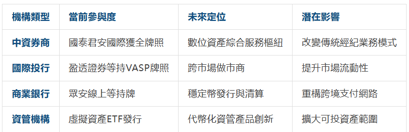 在此背景下,國泰君安國際獲牌事件成為檢驗香港金融中心韌性的試金石。華創證券非銀團隊指出,此次“1號牌升級”獲批進度超預期,預計後續更多擁有國際業務的中資券商將跟進。而東吳證券更是指出,虛擬資產合規化將啟動整個非銀金融產業鏈,形成數位資產發行、流通、管理和應用的協同生態網路。