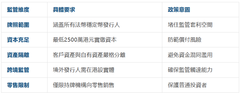 牌照準入雙軌制:本地發行人與錨定港元價值的海外發行人均需持牌,且海外機構必須在港設立實體辦公室與本地管理團隊。