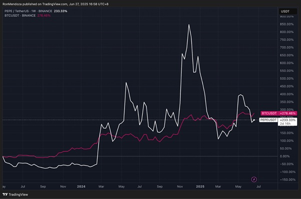 例如,Wall Street Pepe (WEPE) 週四單日漲幅達 68%,過去一個月累計上漲 255%,而同期比特幣僅上漲約 2%。