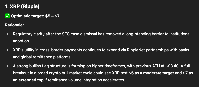 目前,XRP 價格徘徊在 2 美元左右,分析師關注的阻力位約在 3 美元。一旦成功突破這一關卡,ChatGPT 預測年底前升至 5 美元將是可實現的目標。