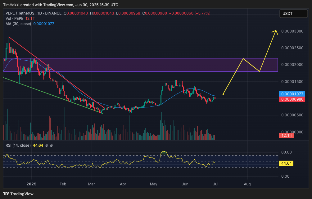 Pepe($PEPE)這款以 Matt Furie 標誌性青蛙角色為靈感的迷因代幣,已成功躋身頂尖迷因幣行列。自 2024 年底以來,它穩居迷因幣市值排名前三,持續領先所有非狗狗主題的競爭對手。
