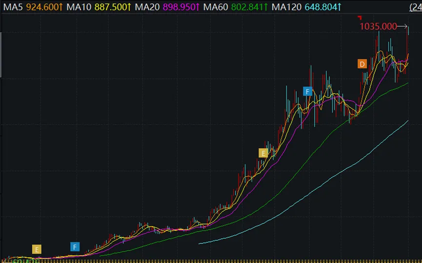 大摩的目標價也做了更新,可能覺得之前給的太保守。早在5月28日也就是股價還在沖高階段,給出了目標價1149,以當時的位置來說還有38%的增長空間,以目前的位置來說的話還有15%的空間。