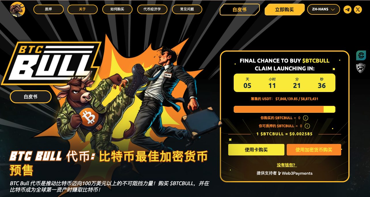 隨著比特幣價格逼近歷史高點11萬美元之際,加密市場上有一款與比特幣深度連結的新代幣正悄悄完成最後階段部署。這款名為 Bitcoin BULL($BTCBULL)的迷因幣,將於 7月7日中國時間晚上10時,正式開放領幣,並同步登陸交易所,而現時仍處於預售尾聲階段,是投資者以底部價格搶進的最後機會。目前 $BTCBULL 預售價為0.00258美元,累計籌資已超過 786萬美元,社群熱度、資金注入與比特幣行情出現罕見共振,成為2025年中期最值得關注的迷因資產之一。
