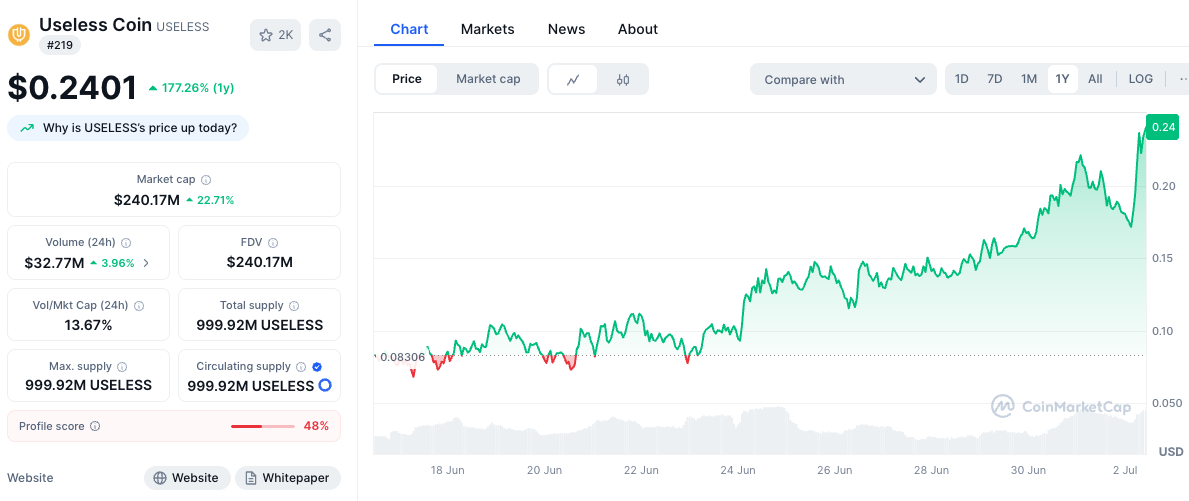 $USELESS在6月引領了迷因幣市場,爆發性上漲了1,635%,幾乎每天都創下新的歷史高點。這數位幣今天達到了最新的歷史高點0.209美元。這個成長展現出驚人的動能,投資人密切關注進一步的上漲動向。