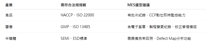 某些產業如食品、醫藥、半導體,對於品質控管、溯源紀錄、批次管理有更高標準。此時若選用通用型MES,將無法符合如HACCP、ISO 13485或GMP等規範。