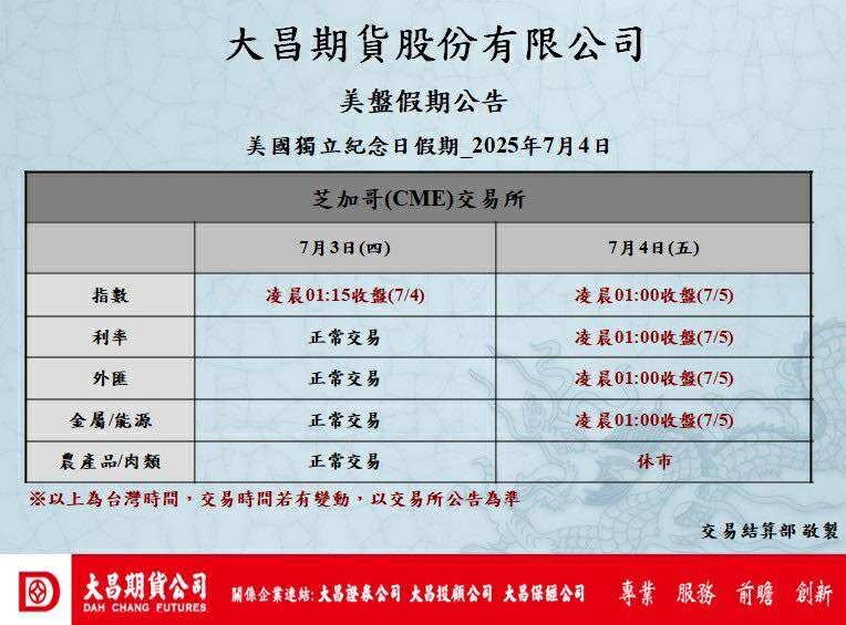 2025/07/04 美國獨立紀念日假期公告,7月3日、7月4日,部分商品提早收盤。