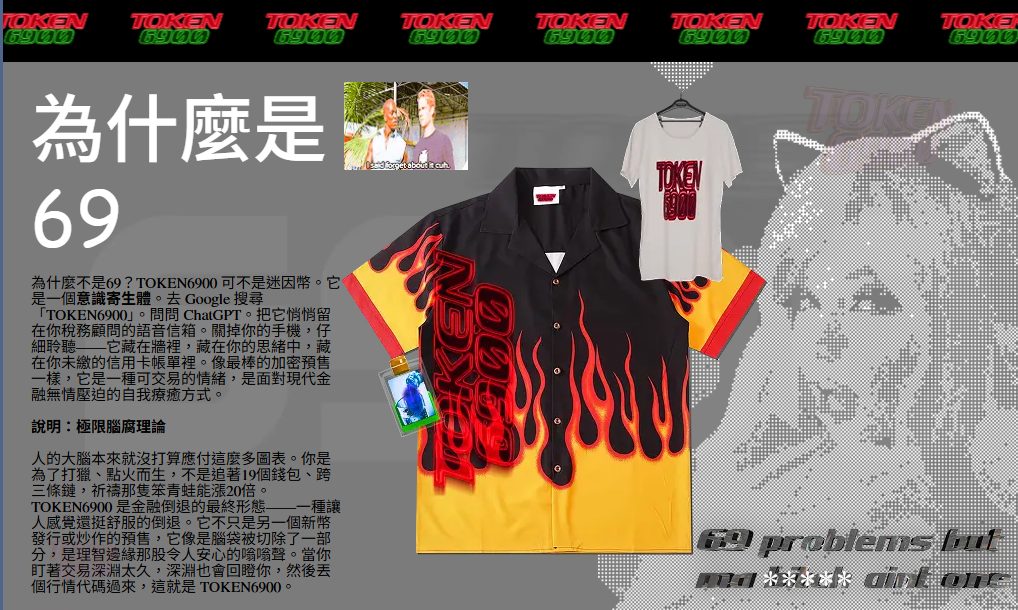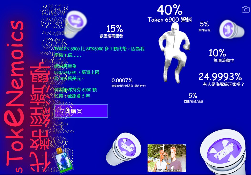 受到2000年代初期網路懷舊與「69」精神啟發,TOKEN6900證明不是每個代幣都需要嚴肅與復雜。當其他項目還在假裝圖表和基本面重要時,它提供市場上最後一個誠實產品:將集體妄想轉化為流動性。甚至比SPX6900多一枚代幣供應,客觀上來說,就是更優秀。