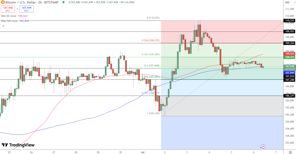 2小時圖顯示出一個低波動性的「斐波壓縮」形態,價格被限制在50%與61.8%斐波回檔區間之間。目前價格處於關鍵移動均線之間:50週期SMA為$108,624,100週期SMA為$107,944。