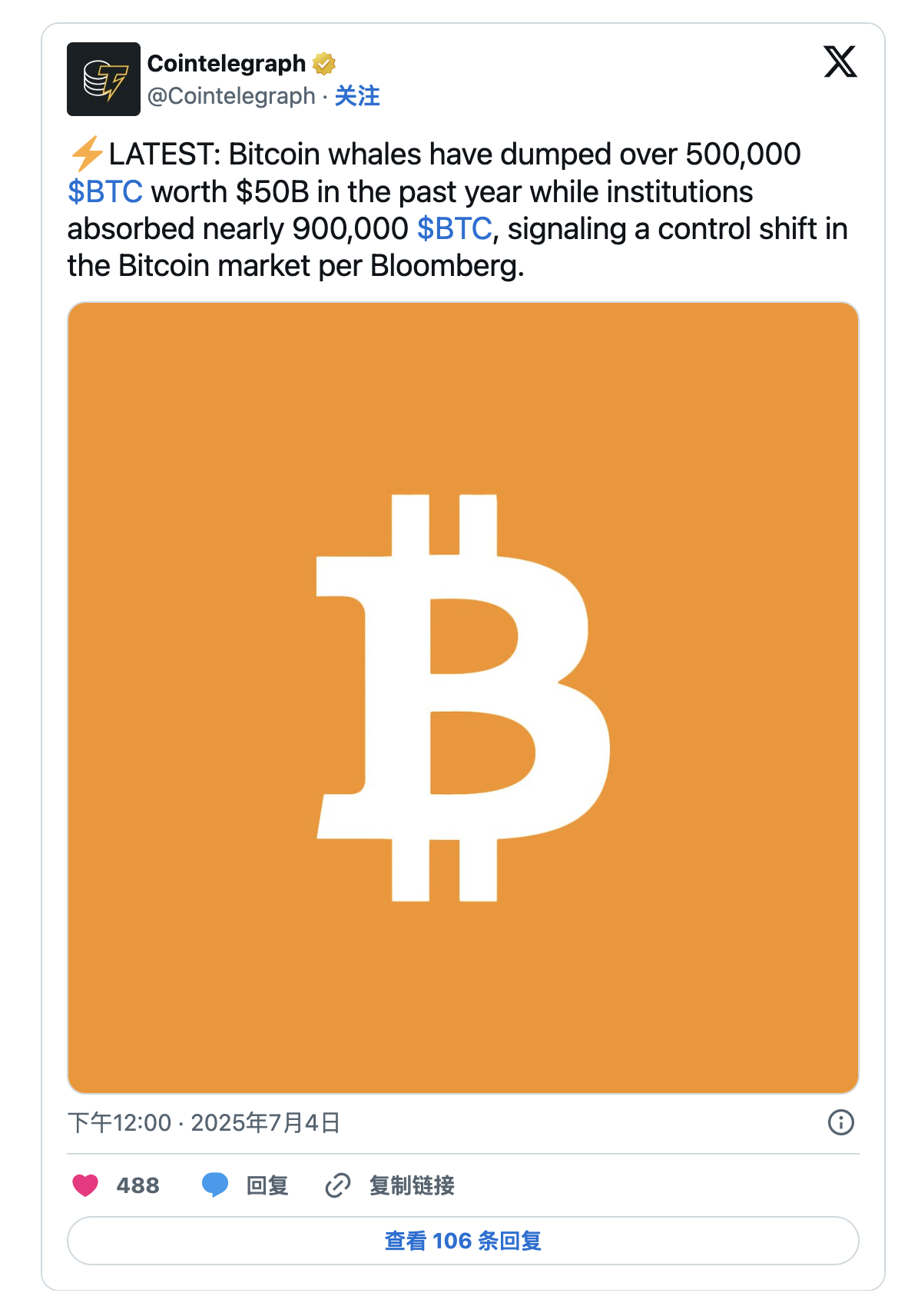 在過去一年中,長期持有比特幣的鯨魚、早期採用者、礦工以及匿名大型持倉者已拋售超過50萬枚比特幣,以當前價格計算約500億美元。然而,這波拋售並未導致市場崩盤,反而是機構投資者迅速介入,吸收的比特幣數量甚至超過鯨魚的拋售量。