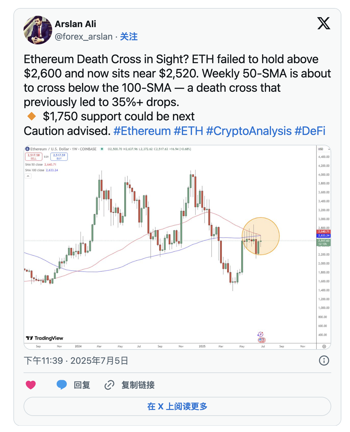 在周線圖上,50日均線(50-SMA)正接近下穿100日均線(100-SMA),一旦形成所謂的“死亡交叉(Death Cross)”,歷史上往往引發高達35%的回調。若此形態確認,ETH可能回踩至 $1,750 支撐位。
