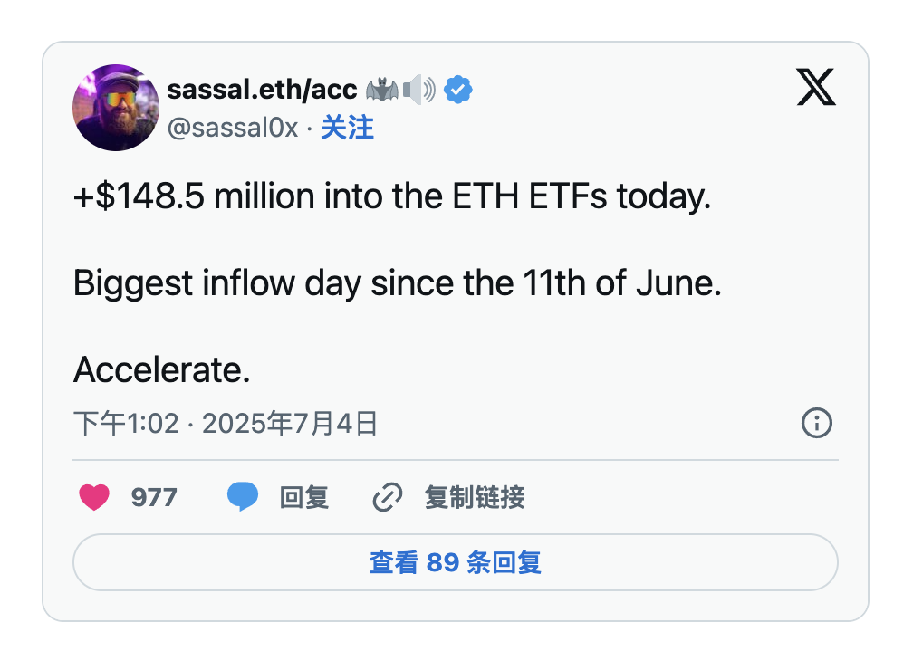 根據最新數據,美國上市的以太坊現貨ETF單日淨流入高達 1.4857億美元,創下自2月以來的第二高單日流入記錄,顯示機構對ETH佈局意願持續升溫。