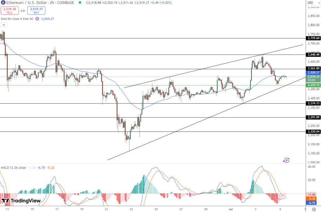 儘管存在部分利空訊號,但市場並非全然悲觀。 ETH目前正測試上漲平行頻道下軌支撐,位於 $2,474 附近。