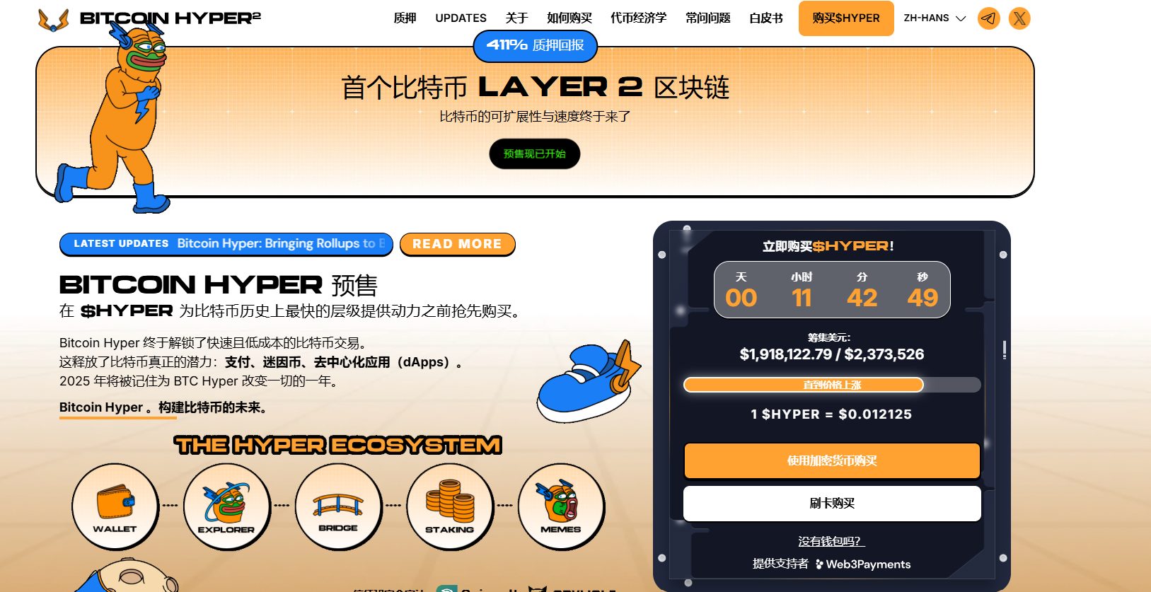 Bitcoin Hyper($HYPER) 是第一個基於 Solana 虛擬機器(SVM)架構 建構的 原生比特幣Layer 2解決方案,其公募預售已突破 $1,900,000,目前已籌集 $1,927,122,目標為 $2,373,526。代幣目前價格為 $0.012125,下一輪價格階梯預計數小時內將觸發。