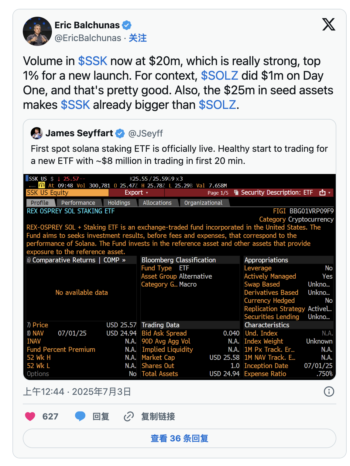 於7月2日,在CBOE Exchange上推出Rex-Osprey Solana 加上質押的一個全新ETF($SSK),成為市場上一個全新的焦點。根據彭博ETF分析師Eric Balchunas在X上的貼文指出,它以大約3,300萬美元的數量和1,200萬美元的流入結束了第一個交易日。