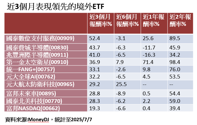 今年4月川普宣布對等關稅後,股市大跌,但一周後宣布暫緩關稅上路,股市又快速反彈,其中有幾檔ETF表現特別亮眼。例如,國泰數位支付服務(00909),在短短3個月內股價上漲52%,反彈力道最強勁。另外,第一金太空衛星(00910)近3個月漲幅36.9%,近一年漲幅更高達71%,是近一年來表現最強勁的ETF。另外,元大航太防衛科技(00965)近3個月漲幅29.2%,在俄烏戰爭、以伊衝突下股價持續攀高,近期因為以伊暫時停火,進入修正階段。值得注意的是,這些ETF都是投資境外股票,近期的績效表現,都涵蓋了台幣升值的匯率風險。