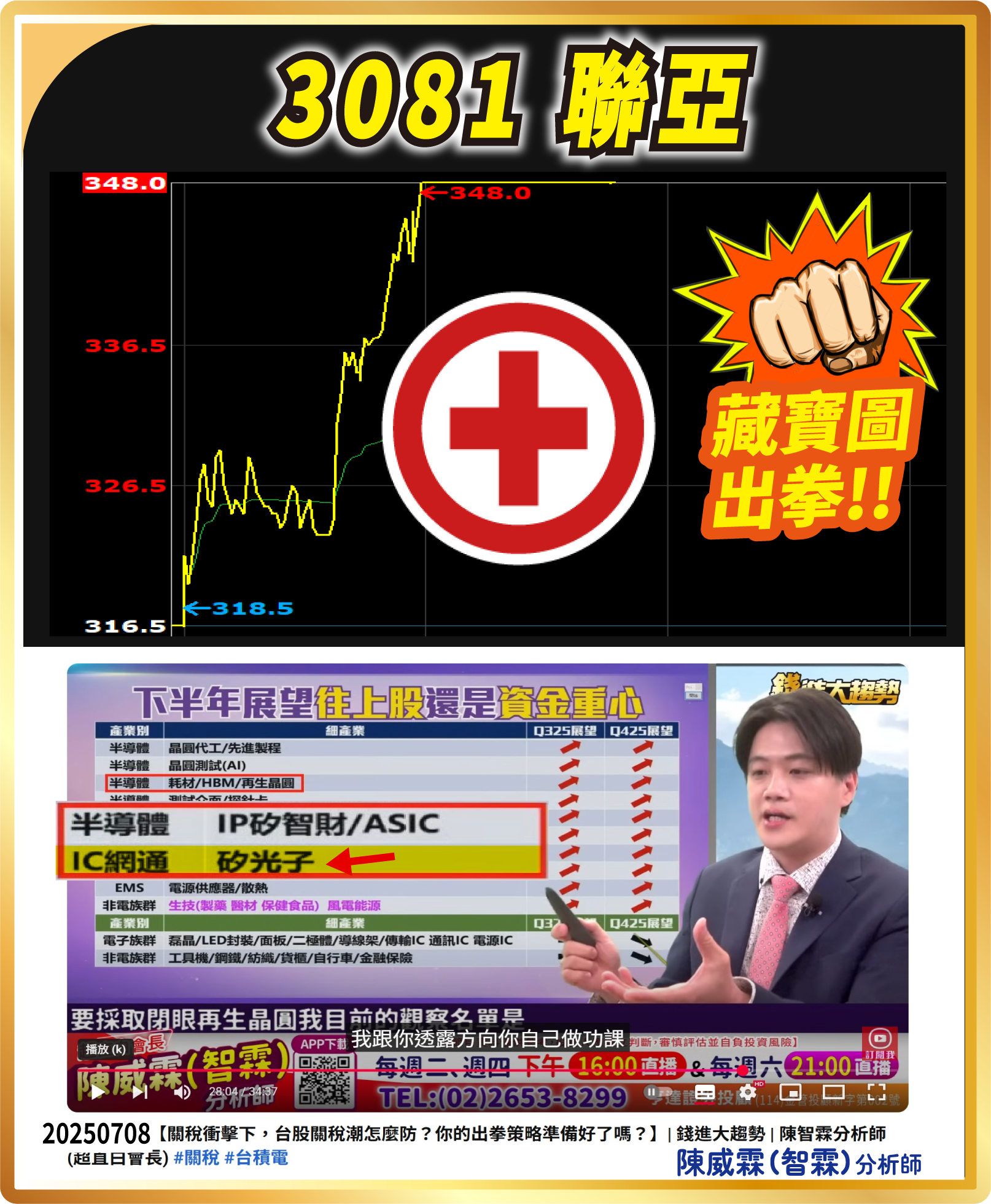 台股量縮盤整操作難度高,老師已經在上週三分享「藏寶圖」,昨天直播更是特別點名三個要「出拳族群」,今天立馬驗證,世芯-KY(3661-TW)上漲近5%,再創波段新高,矽光子與光通訊題材的聯亞(3081-TW)盤中攻上漲停,華星光(4979-TW)、波若威(3163-TW)也同步上漲約3~4%,這些都是老師早公開的藏寶圖族群,如果你昨天已經照老師的邏輯、、有策略的布局,今天這一波就是你收割的時機。