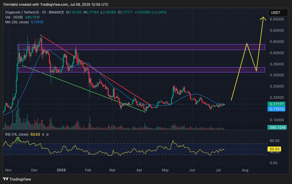 此外,從去年 11 月至今年 4 月的技術圖形中可觀察到一個「下降楔形」形態,通常意味著潛在的強勢突破。若多頭動能延續,DOGE 預計在未來數月挑戰 $0.50 關口,從目前價格推算,上漲空間接近 192%。