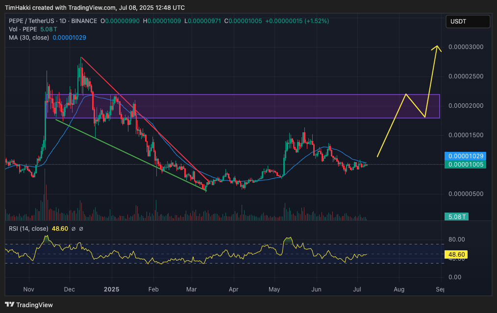 若全球宏觀經濟與地緣政治風險持續降溫,$PEPE 預計在今夏結束前再度展開一波強勢反彈行情。