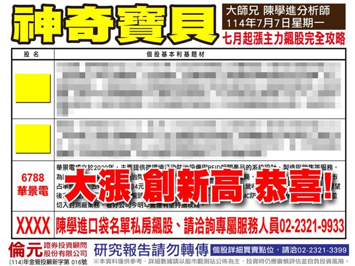 (3)我們6/30日235元鎖定之後,今日續創新高,收在277.5元;各位想想:同為設備股的均華(6640),去年每股賺14.62元,今年力拼2個股本,目前股價來到728元;設備股的萬潤(6187),去年每股賺14.57元,今年力拼2個股本,目前股價來到397元;你覺得:華景電還會不會漲呢?