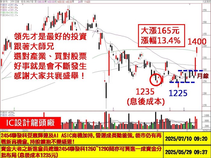 (3)外資調高評等及目標價,我們5/29日1260元(息後成本1235元)鎖定之後,連買二筆,今日大漲來到1400元作收,一張價差達+165元,十張就是165萬,一切都敢講在前面,相信大家都有目共賭!感謝大家共襄盛舉!