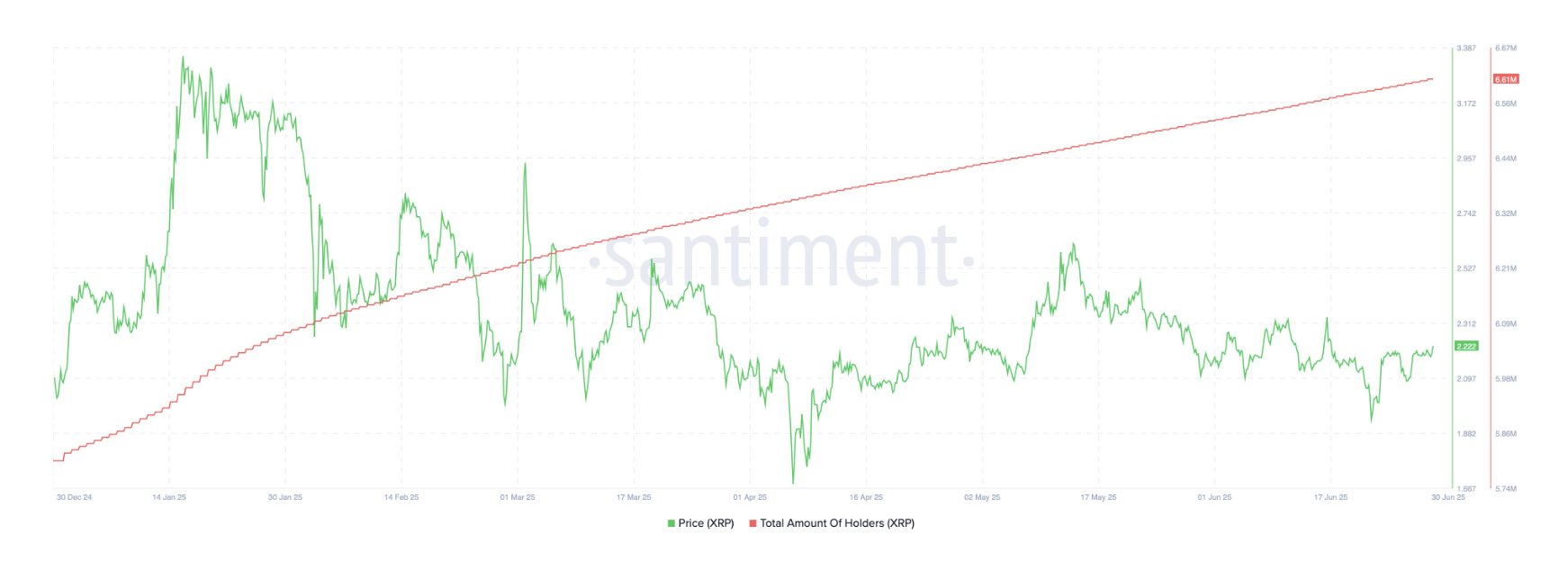 另一方面,需求側訊號也在增強-根據 Santiment 數據顯示,XRP 持幣位址數已正式突破 660 萬個,鏈上活躍度顯著提升,為後續價格上行提供堅實支撐。