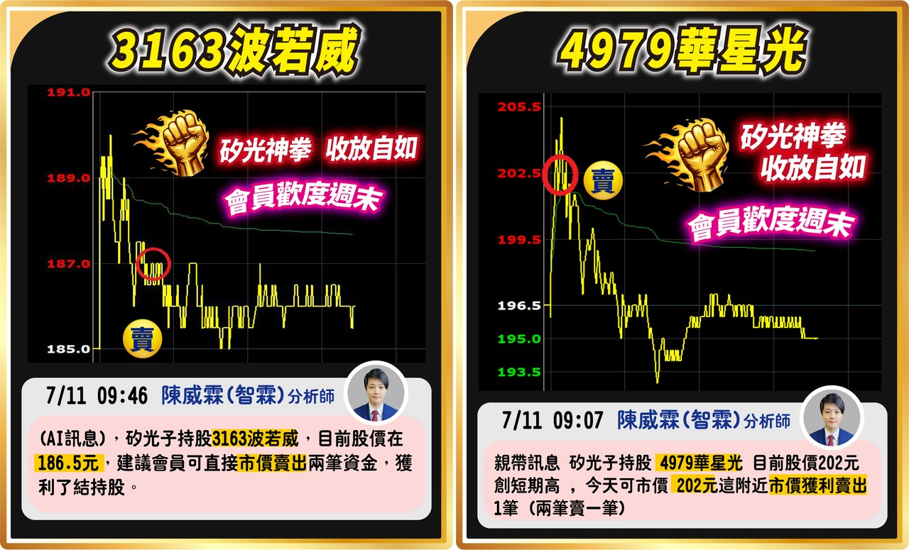 反觀AI族群,即使大盤上漲,卻有多檔高位個股出現回檔走勢,「矽光之拳」的華星光(4979-TW)、波若威(3163-TW),今天也於高檔帶領會員獲利調節,當前位階操作需講究節奏與成本控管,矽光神拳固然強勢,但更需要靈活操作與風控策略。